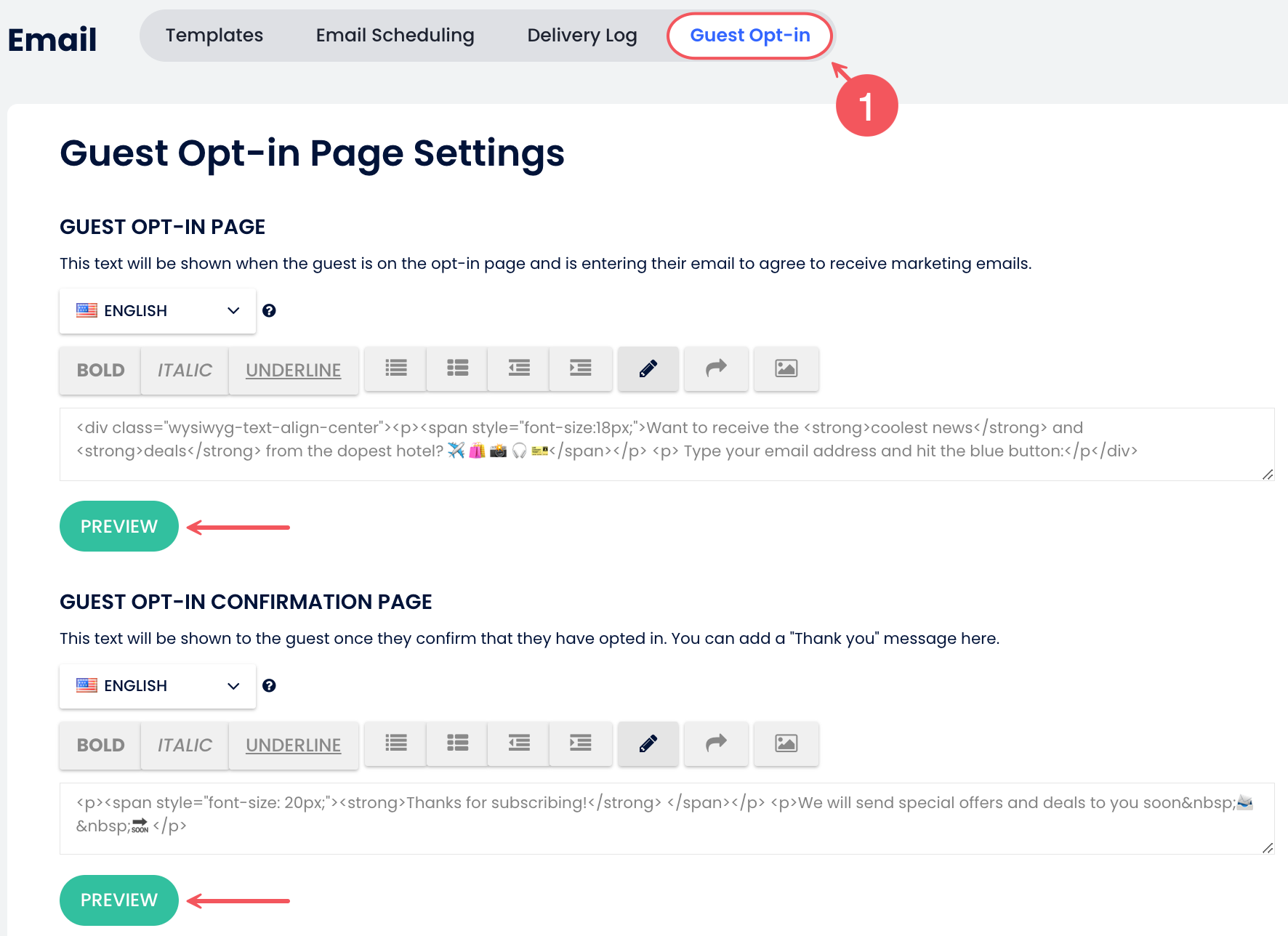 - Personalizar o texto na página de consentimento (onde os hóspedes podem se inscrever para receber e-mails de marketing).