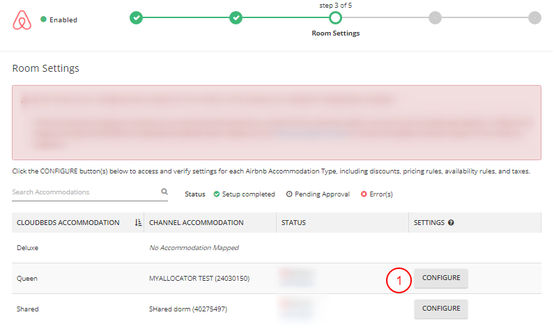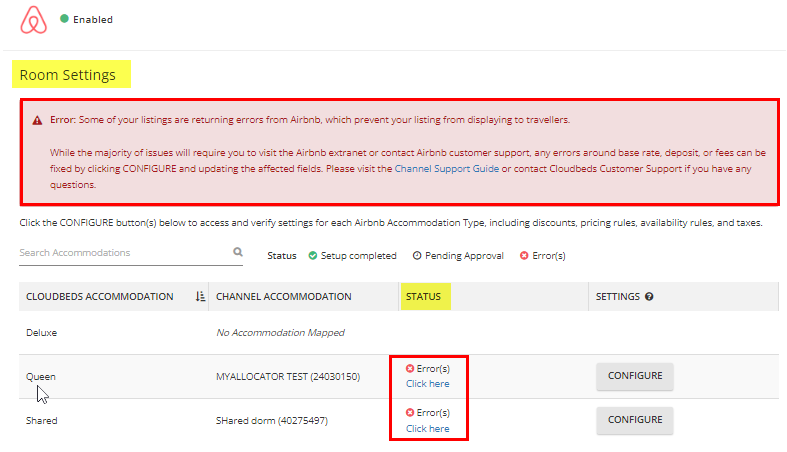 Na página de Configurações de Quartos, verifique se os anúncios estão corretamente mapeados e livres de erros/configurações ausentes: