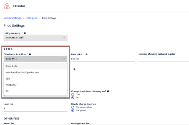 Se você tiver Tarifas avançadas para canais, você pode escolher qual plano tarifário da Cloudbeds alimenta a tarifa padrão do Airbnb.