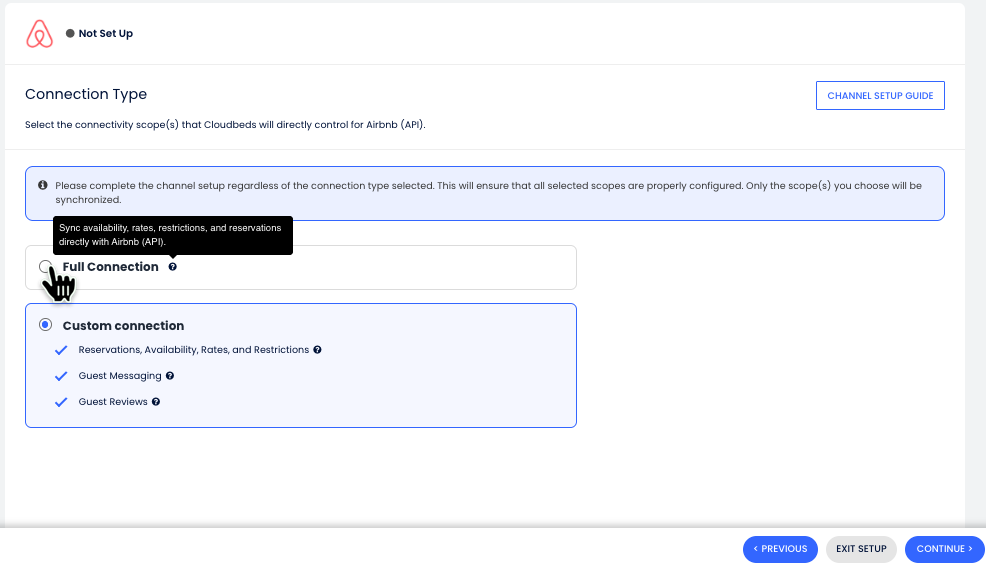 - Se você deseja conectar através de um gerenciador de canais de terceiros (SiteMinder, iHotelier, SynXis, etc.) para usar apenas ferramentas específicas de Comunicação com Hóspedes da Cloudbeds, você pode optar por uma Conexão Personalizada e seguir os passos neste guia: Mensagens e Avaliações de Hóspedes para o Airbnb e Expedia com Channel Managers de Terceiros.