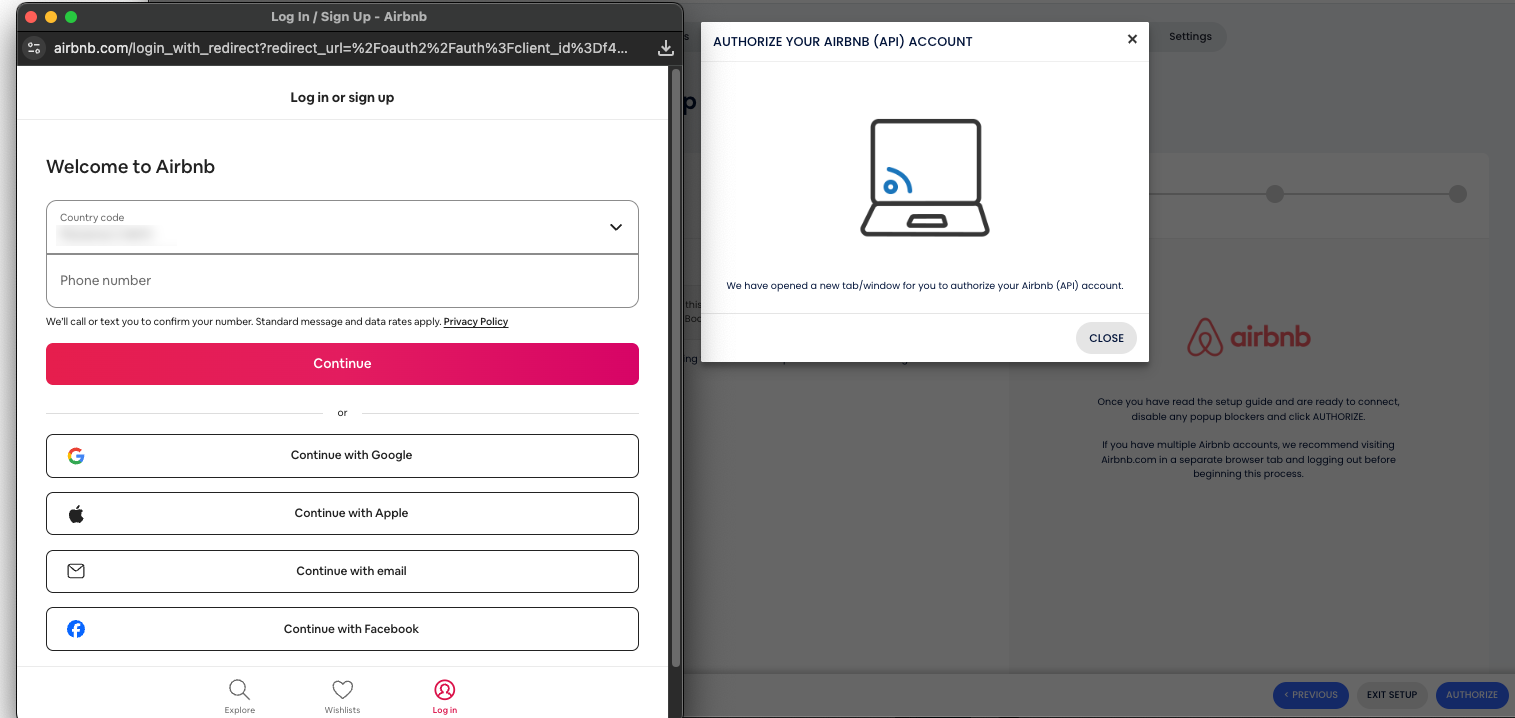 Uma janela chamada “Autorizar sua conta do Airbnb (API)” vai aparecer. Verifique se o bloqueador de pop-ups do seu navegador está desativado.