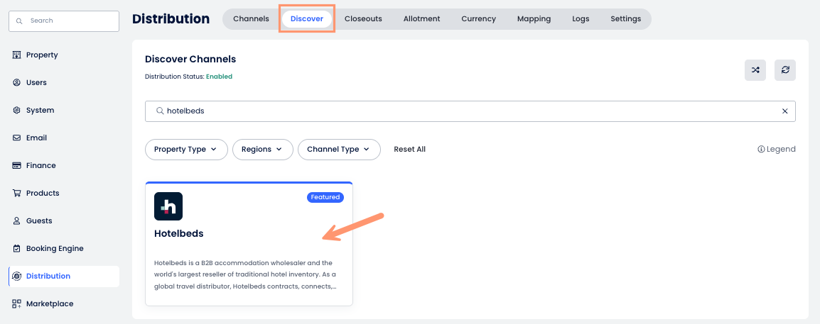 - Na guia Descubra, pesquise por Hotelbeds e clique no cartão do canal;