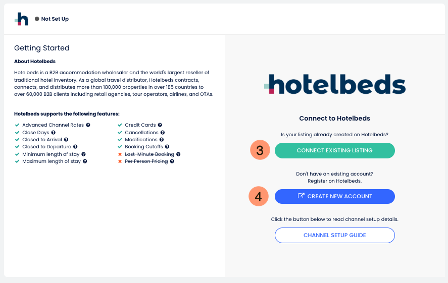 - Se você já tem uma conta no Hotelbeds, clique em Conectar Anúncio Existente;