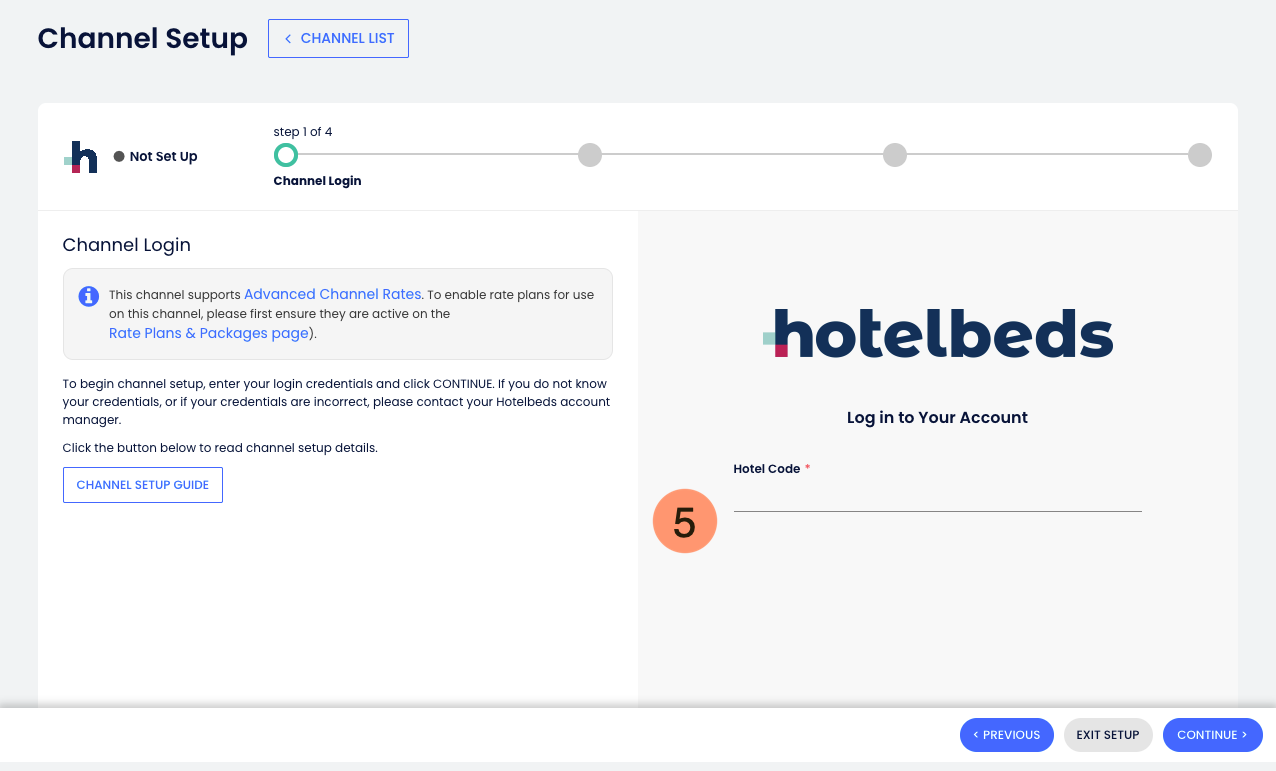 - Insira seu Código do Hotel do canal (também chamado de HBX Hotel ID) e clique em Continuar;