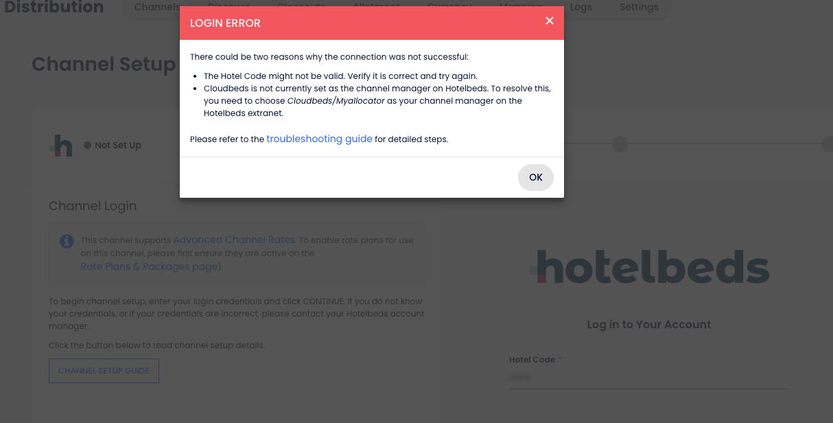 - A Cloudbeds pode não estar selecionada como gerenciador de canais no Hotelbeds. Atualize isso na extranet do Hotelbeds e tente novamente.