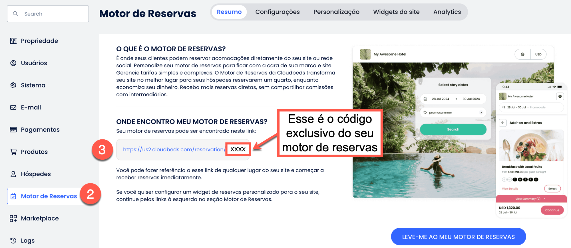 Depois de adicionar o código do widget, certifique-se de que o XXXX seja substituído pelo código exclusivo do seu Motor de Reservas que pode ser encontrado na sua conta do PMS da Cloudbeds, conforme mostramos abaixo: