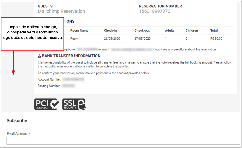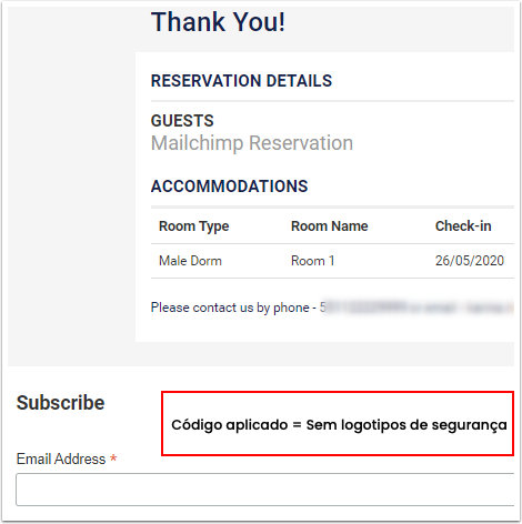 O formulário de inscrição do Mailchimp pode ser adicionado somente no final da reserva, na página de confirmação onde são exibidas todas as informações da reserva.
