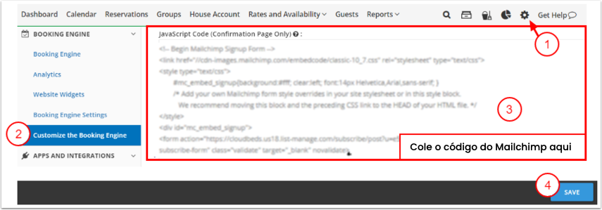 - Uma vez que a conta estiver criada, siga os passos abaixo para incorporar o Mailchimp no Motor de Reservas.