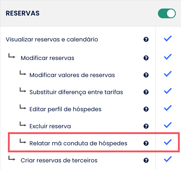 Todos os usuários existentes com o seletor de Alterar Reservas ativado (verde) terão a funcionalidade Relatar má conduta de hóspedes ativada automaticamente - Todos os outros usuários terão essa funcionalidade desativada por padrão.