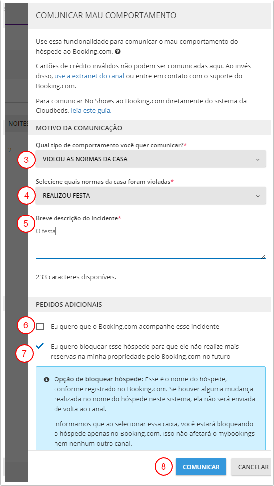 Passo 4 - Relatar um hóspede e bloqueá-lo no Booking.com