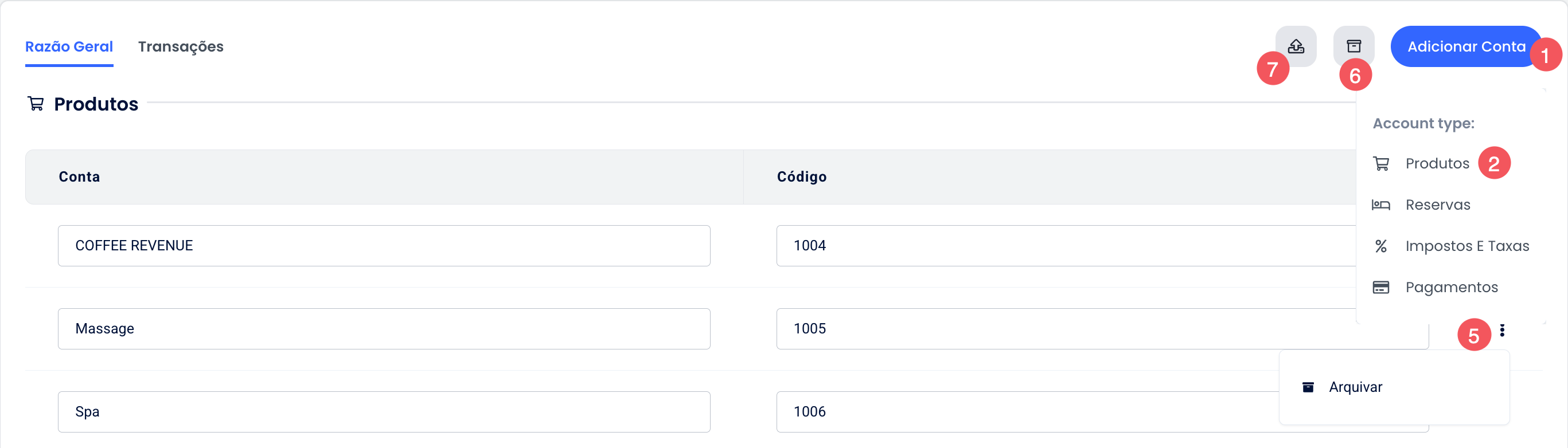 - Os três pontos ao lado de uma conta permitem arquivá-la (ocultá-la da visualização);