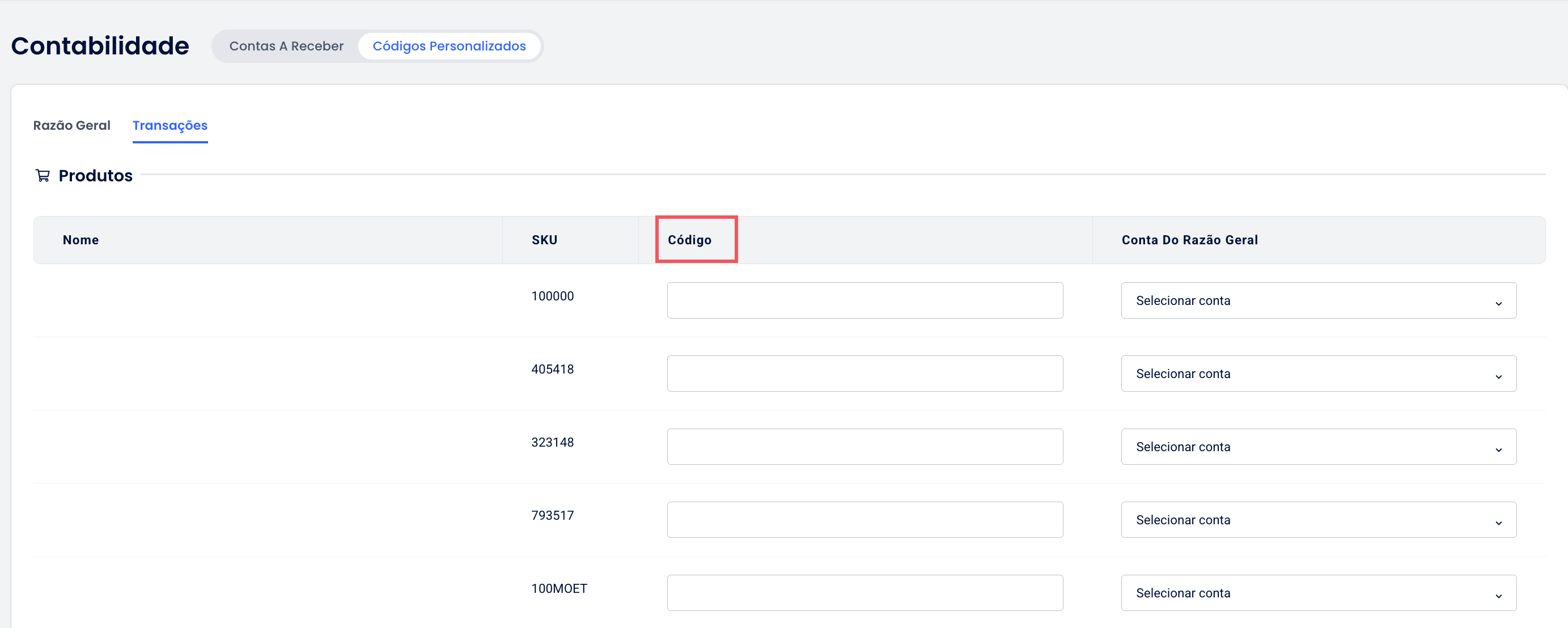 Se você decidir usar os Códigos de Transação Personalizados, insira um código para cada tipo de transação. Se deixar alguns sem código, os dados financeiros dessas transações podem não ser correspondidos corretamente em seus relatórios ou ao serem compartilhados com outros sistemas.