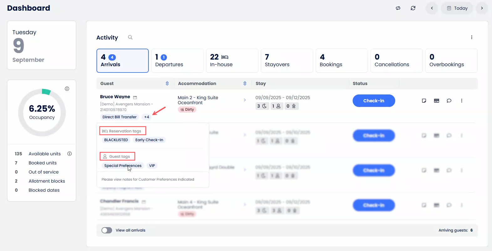 - Ambos os recursos de Marcação de Atributos e Status de Hóspedes no PMS da Cloudbeds permitem aos usuários identificar hóspedes.