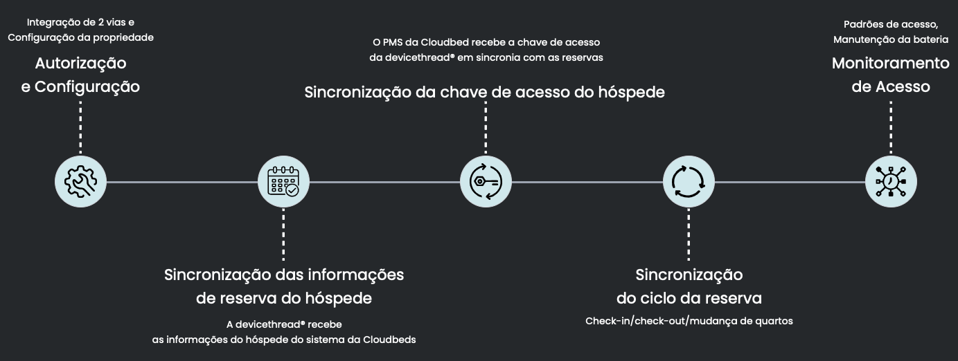 - Autorização e Configuração: Importe definições da propriedade do sistema da Cloudbeds e sincronize quartos e áreas comuns, horários personalizados de check-in e check-out e dimensões dos códigos na devicethread®.