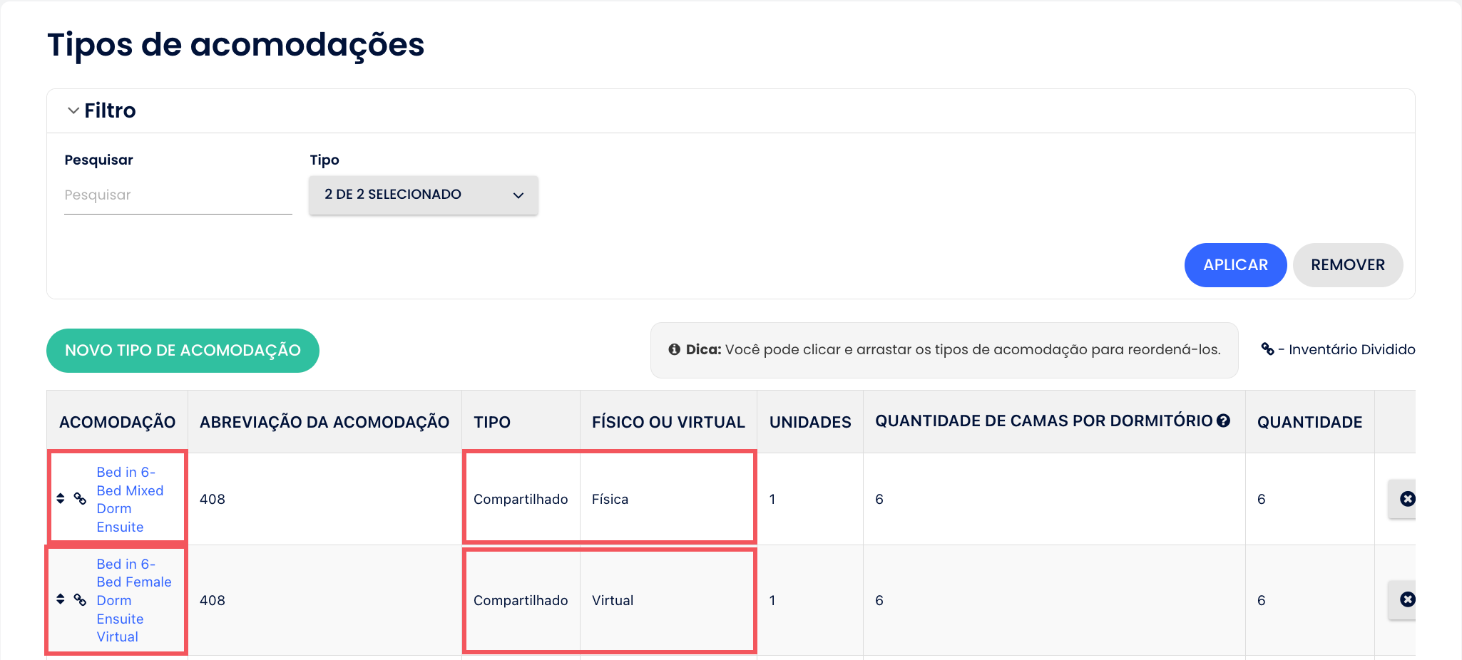 - Crie um tipo de acomodação "Cama em Dormitório Feminino com 6 Camas e Banheiro Privativo" e também vincule-o às mesmas camas físicas: 408-A, 408-B, 408-C, 408-D, 408-E e 408-F.