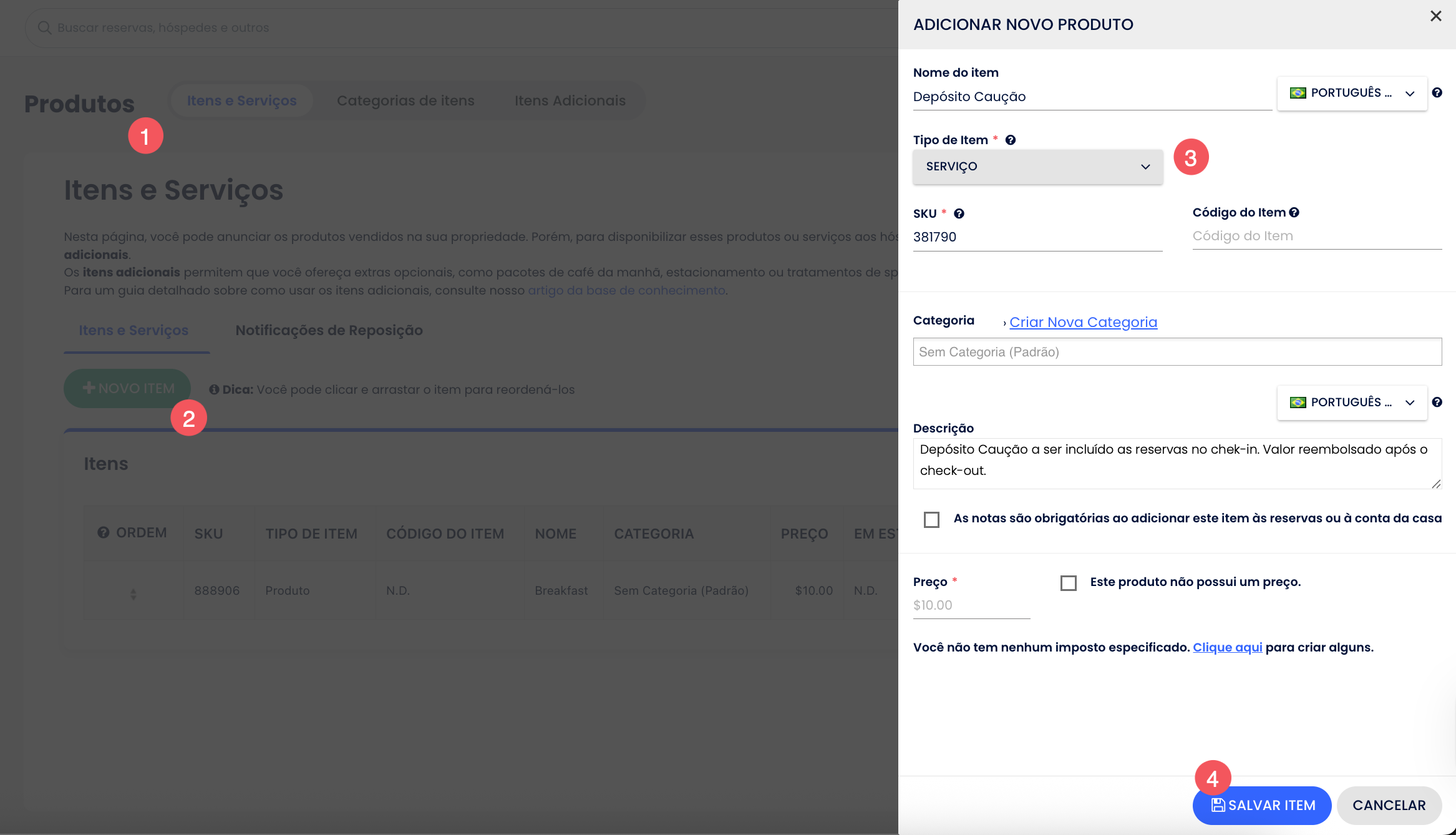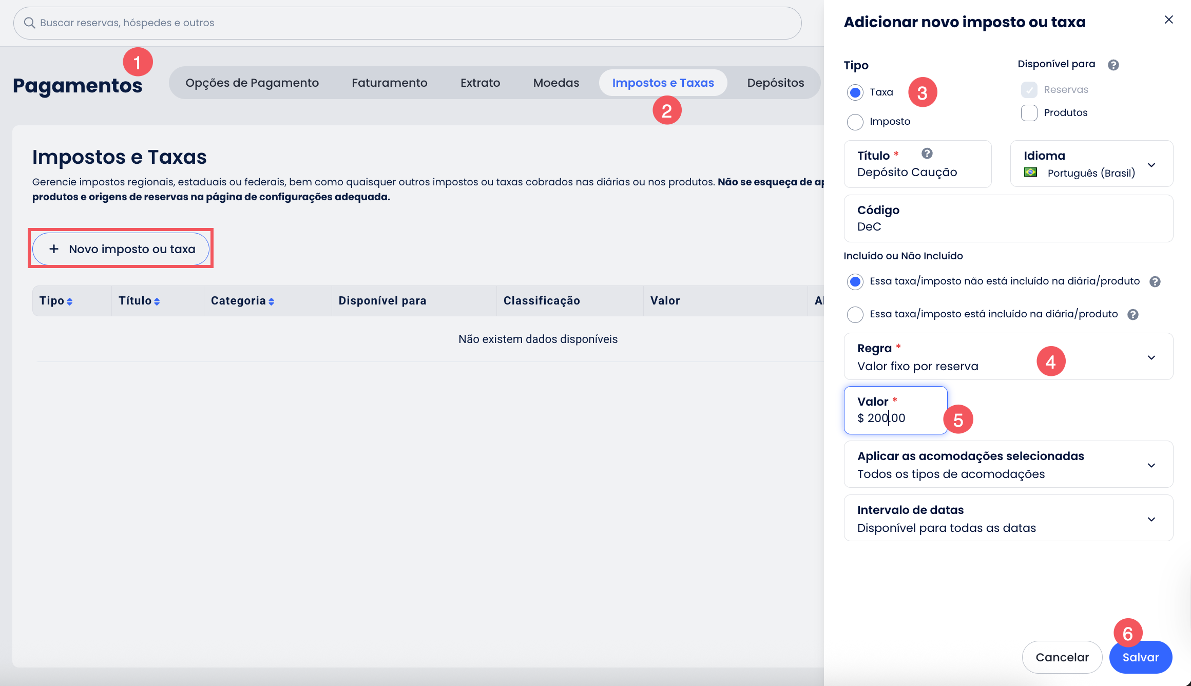- Adicione uma nova taxa como Depósito Caução (ou Depósito Caução para Danos);