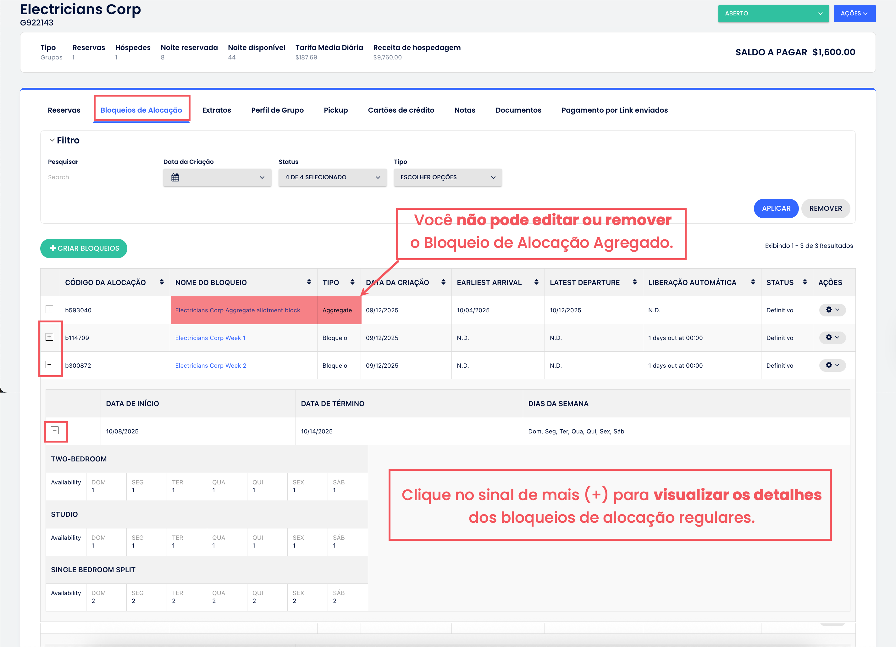 Ao selecionar o Bloqueio de Alocação Agregado, os números de Pickup exibirão os quartos bloqueados e reservas combinadas em todos os bloqueios do grupo. Isso fornece uma visão geral completa da disponibilidade e do desempenho de relance.