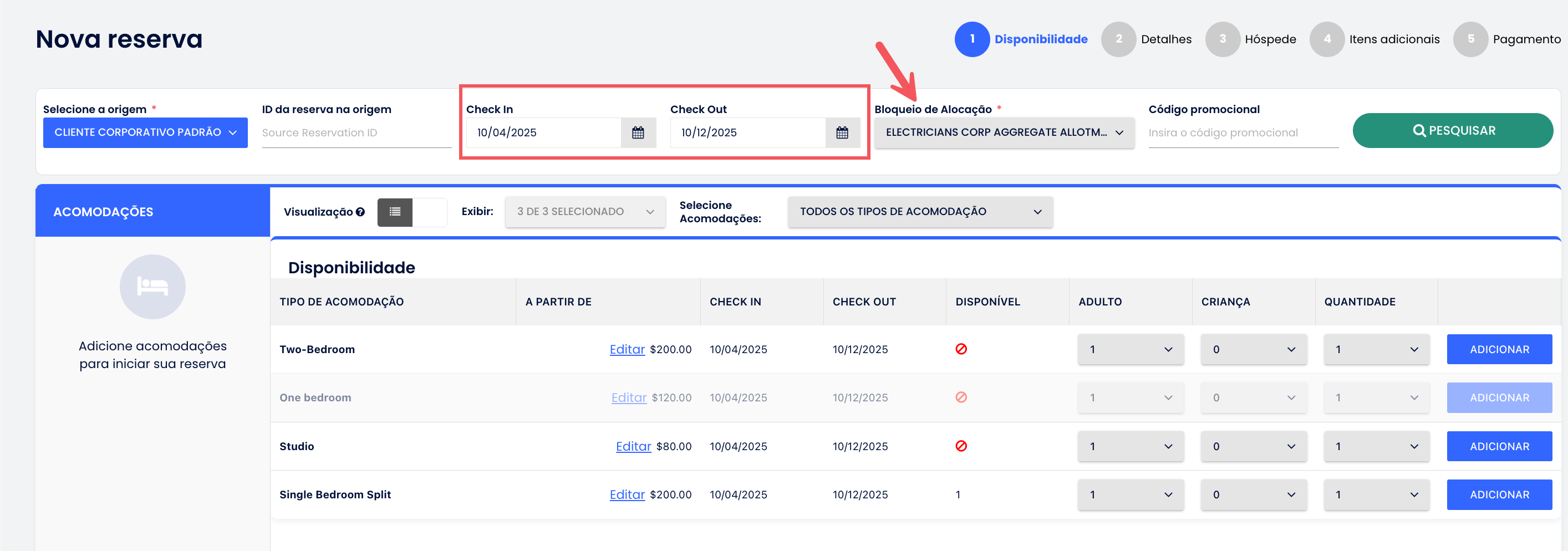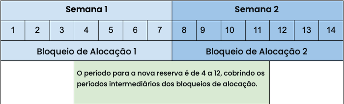 As Reservas devem ocorrer estritamente dentro dos intervalos de datas dos bloqueios de alocação. Dias extras antes do início do primeiro bloqueio ou após o término do último bloqueio não podem ser reservados através do agregado.