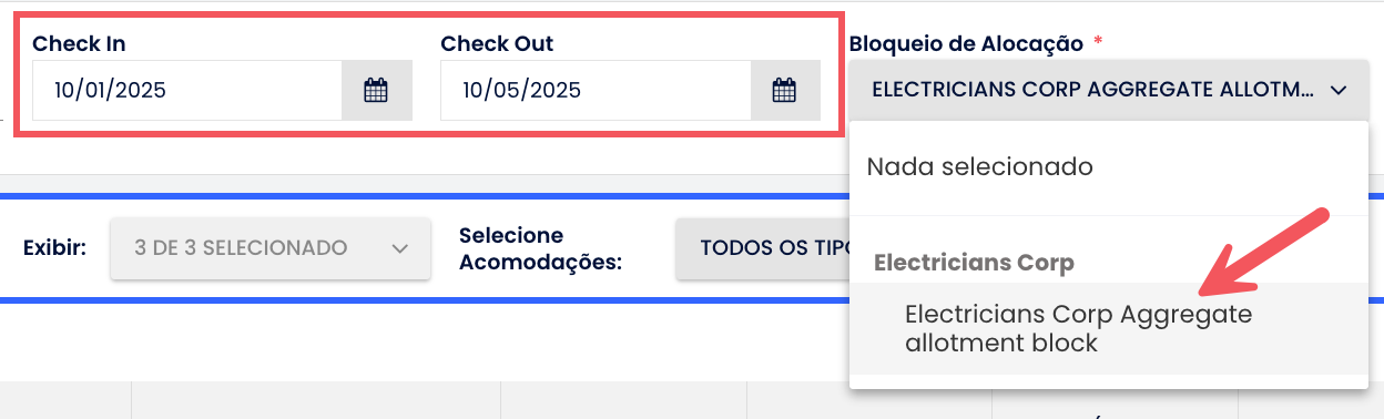 Mesmo que as datas da estadia que você selecionar caiam inteiramente dentro de um dos bloqueios regulares (por exemplo, 1 a 5 de outubro dentro de “Electricians Corp Week 1”), a opção de bloqueio de alocação agregado ainda aparecerá no menu.