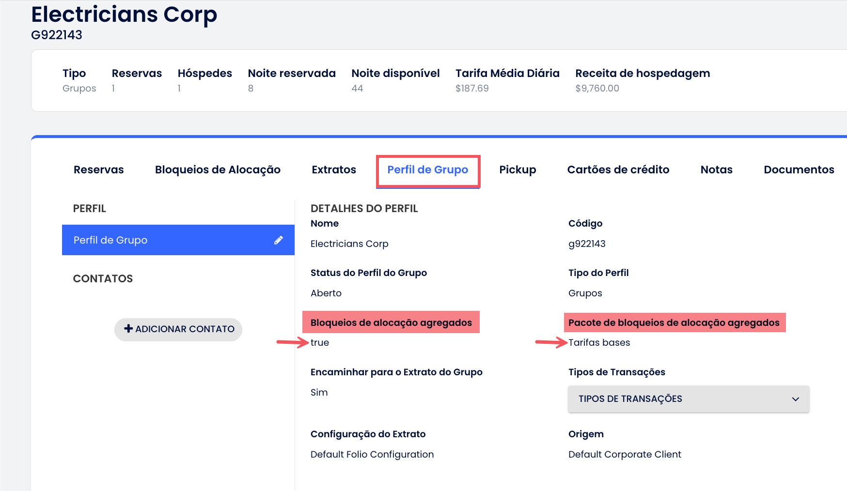 Guia do Perfil do Grupo – Nesta guia, você verá uma confirmação de que os Bloqueios de Alocação Agregados estão ativados (exibido como “true”) junto com o plano tarifário ou pacote selecionado para reservas.