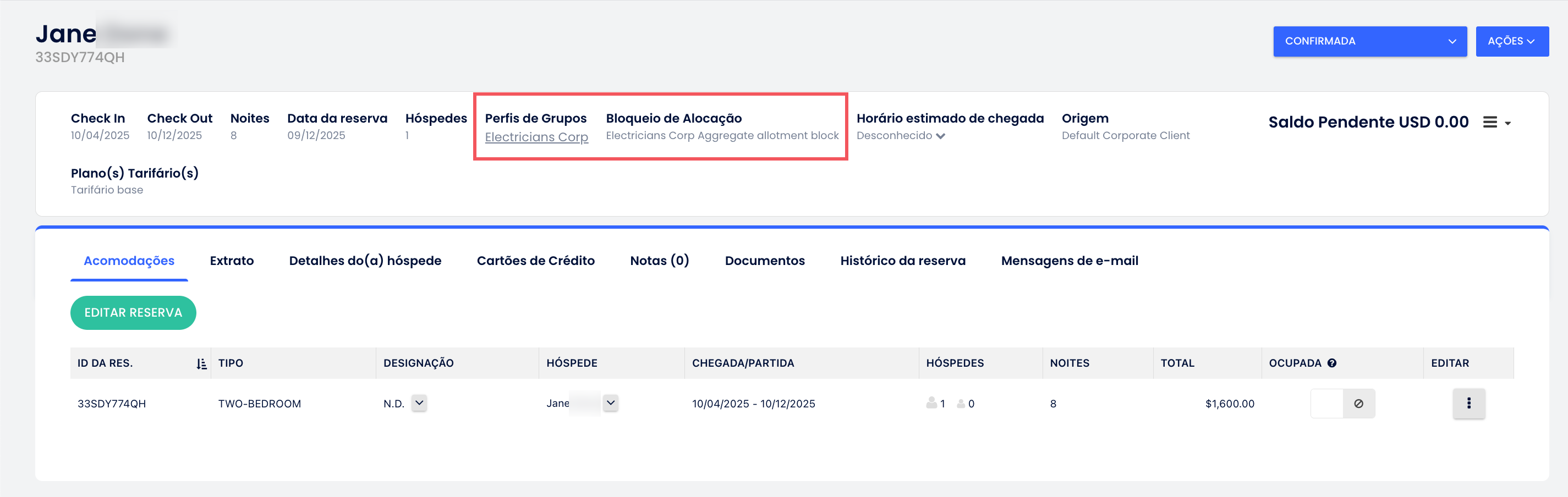 Criação de Reserva – Quando você inicia uma nova reserva, o Bloqueio de Alocação Agregado sempre aparecerá no menu de Bloqueio de Alocação se o Perfil do Grupo foi criado com esse recurso ativado.