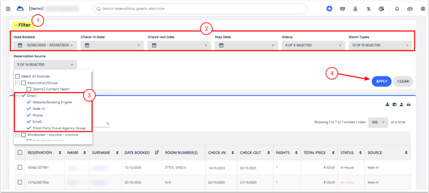 - Aplique seus filtros de data e status (Data da reserva, Check-in/Check-out, Data da estadia, Status, Tipos de acomodação);