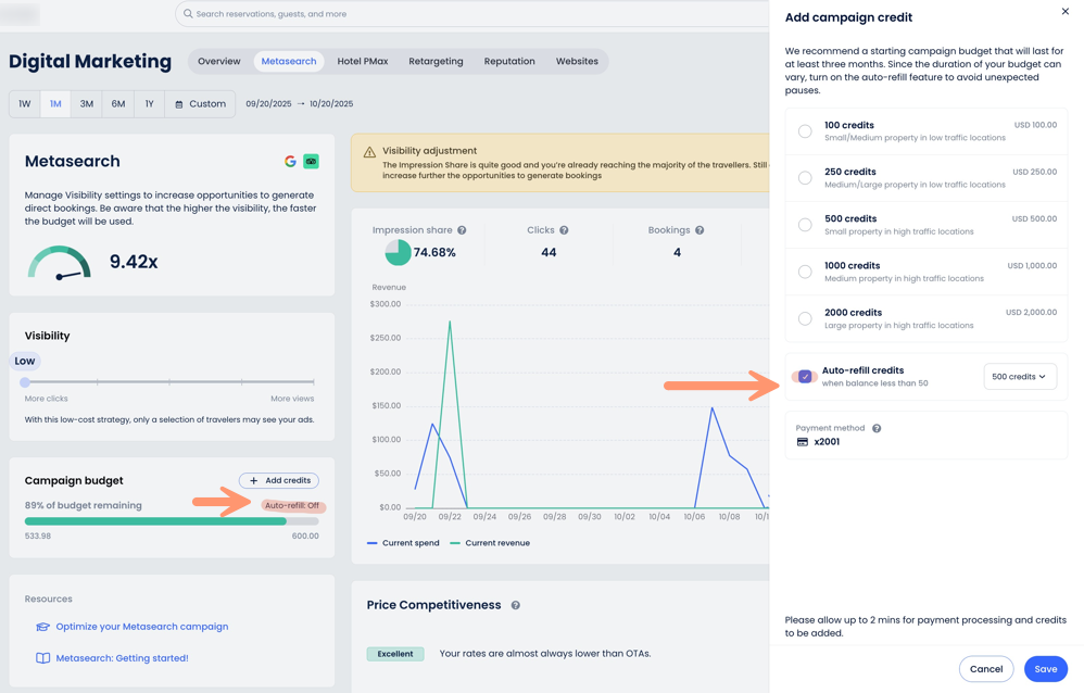 - Resposta: Hoje, a caixa de Recarga Automática de créditos está selecionada por padrão sempre que você abre o painel Adicionar crédito de campanha para recarregar seus créditos de Marketing Digital. Isso significa que, se você quiser apenas uma compra única, deve desmarcar a Recarga Automática de créditos antes de clicar em Continuar ou Salvar.