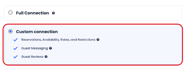 - Selecione a(s) funcionalidade(s) que você deseja sincronizar: Conexão completa ou Mensagens para Hóspedes e/ou Avaliações de Hóspedes.