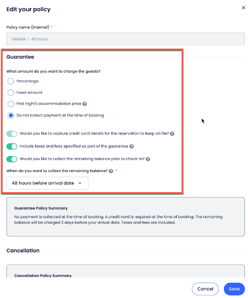 - Umanova guia de Cancelamento e Pagamento antecipado. Aqui é onde você pode visualizar os modelos de política inteligente e ajustar opções específicas conforme necessário. Cada modelo inclui três componentes principais: o Método de Garantia (Depósito, Apenas Cartão de Crédito ou Sem Cartão de Crédito), o plano de Pagamento do Saldo Restante e a Política de Cancelamento.
