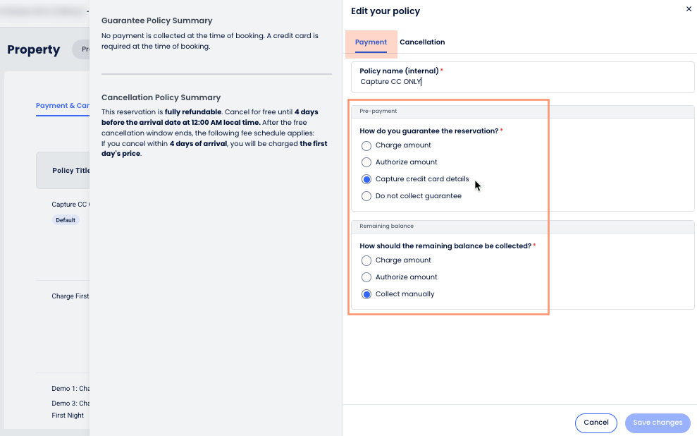 - Umanova guia de Cancelamento e Pagamentos. Aqui é onde você pode visualizar os modelos de políticas inteligentes e ajustar opções específicas conforme necessário. Cada modelo inclui três componentes principais: o Método de Garantia (Depósito, Apenas Cartão de Crédito ou Sem Cartão de Crédito), o plano de Pagamento do Saldo Restante e a Política de Cancelamento.