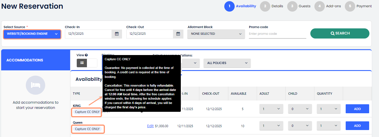 - Ao criar uma reserva, o nome da política é exibido em cada quarto/plano tarifário.