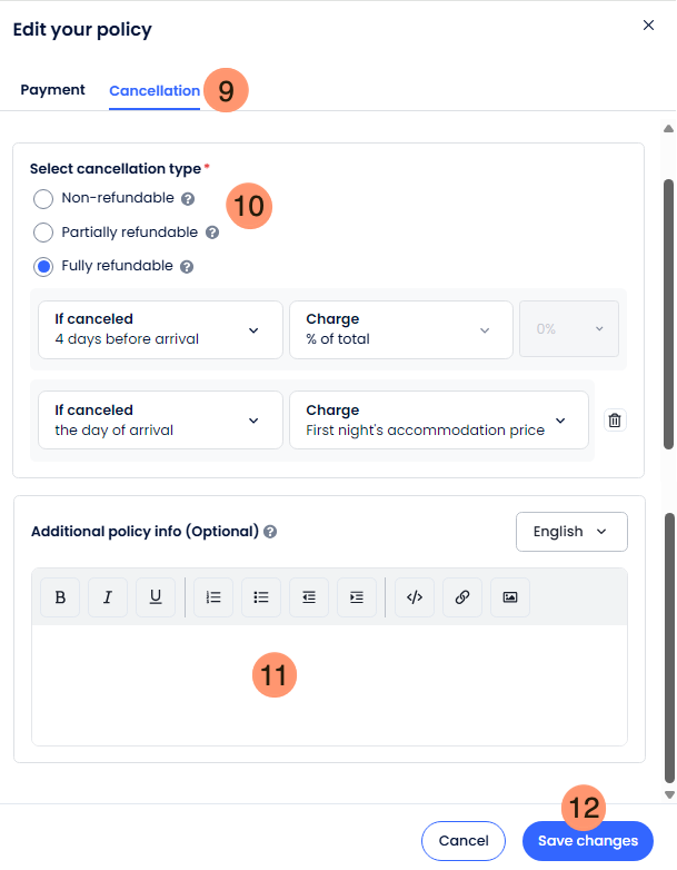 - Preencha as informações adicionais da política: você pode personalizar os detalhes que são exibidos aos seus hóspedes. Este texto aparece no motor de reservas e nos e-mails de confirmação.
