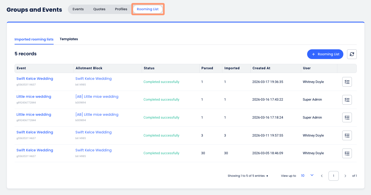 A guia de Lista de Hóspedes oferece um fluxo de trabalho atualizado e validado para designação de hóspedes em bloco. Ela oferece suporte a reservas para vários hóspedes, validação de arquivo completo antes da criação da reserva e links públicos seguros que permitem que coordenadores externos insiram dados de hóspedes diretamente no sistema.