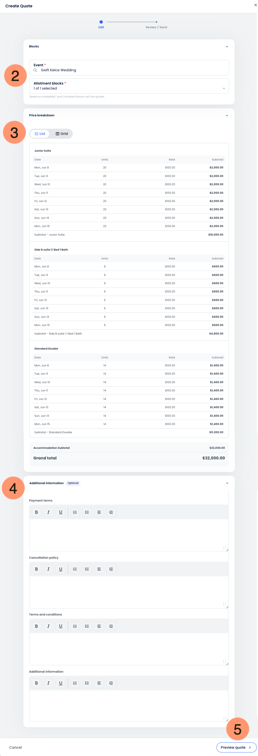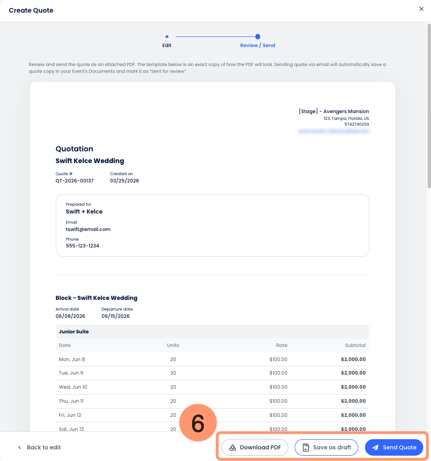 4. Pré-visualização: Clique em Pré-visualizar cotação para revisar o documento com a marca, incluindo o logotipo da sua propriedade e os dados de contato;