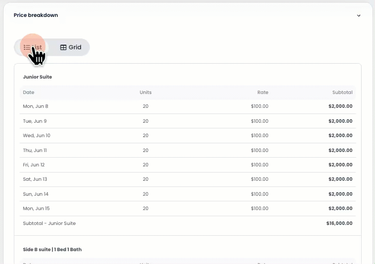 • Visualização em lista: Um detalhamento completo, data a data, de quartos, unidades e tarifas.