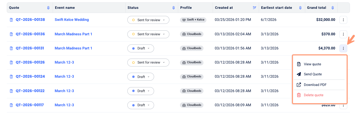 2. Evento Específico: Abra um evento específico e clique no botão Criar Cotação no topo da página. Isso vincula automaticamente a cotação a esse evento, poupando um passo no processo.