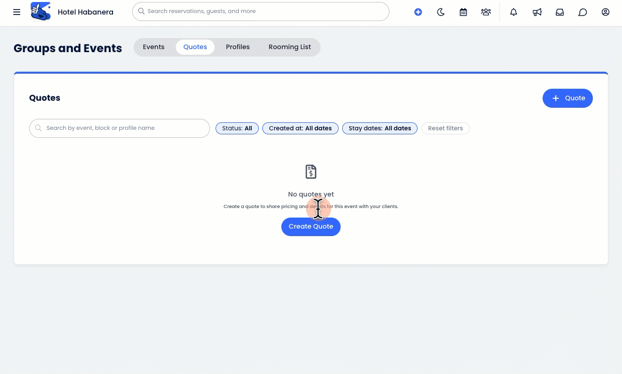 1. Na guia de Cotações Global: Navegue até a guia Cotações na central de Grupos e Eventos e clique em +Cotação. Essa é a melhor opção para ver todas as cotações de diferentes eventos em um só lugar.