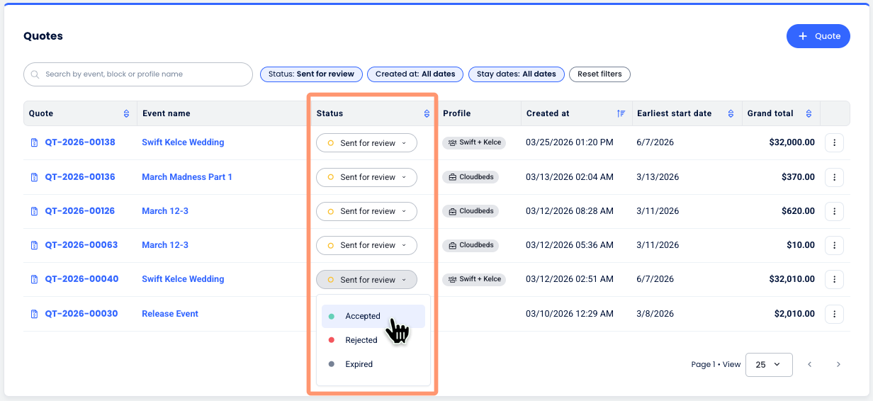 2. Use as caixas de seleção para marcar ou desmarcar status específicos, como Rascunho ou Aceito, para isolar cotações específicas em seu funil de vendas;