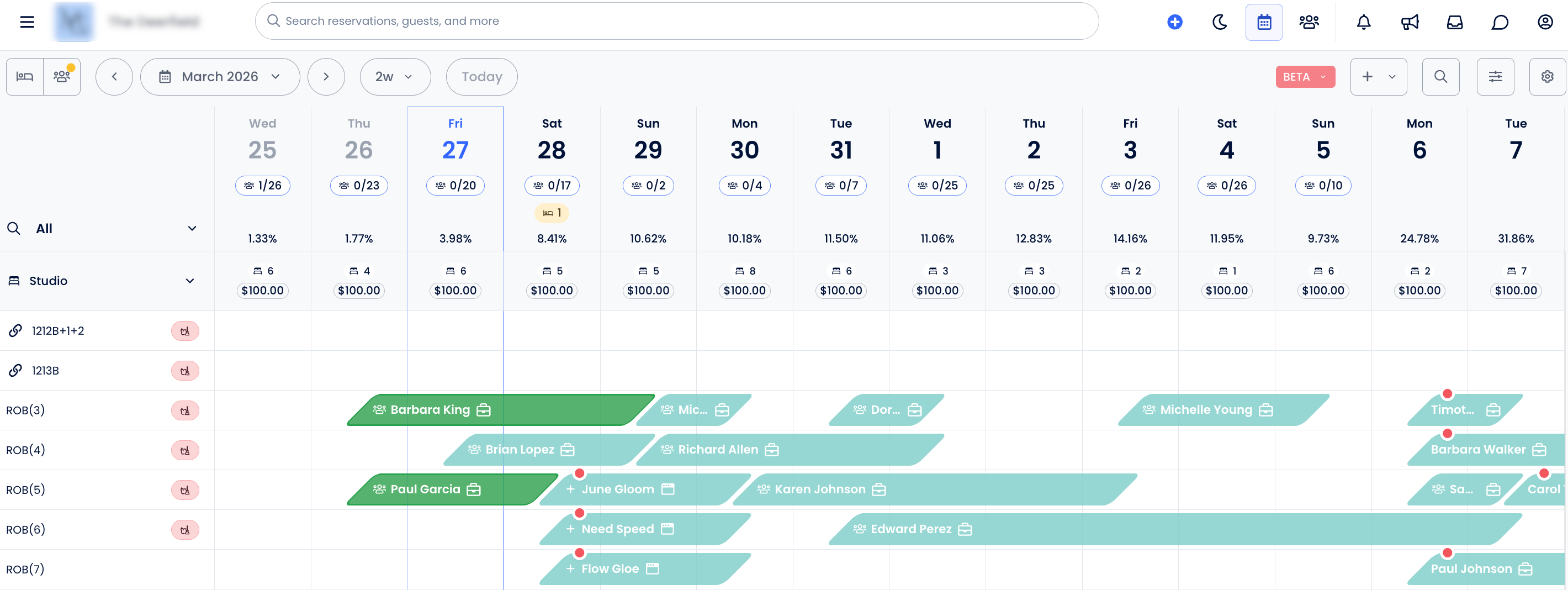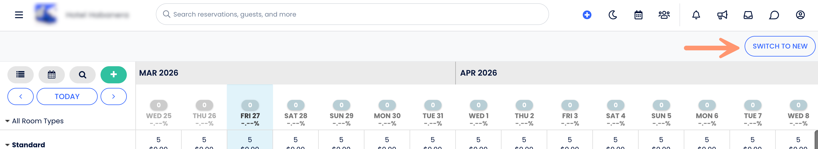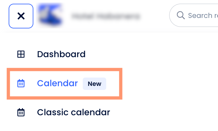 Você pode usar a nova Barra de Pesquisa no canto superior direito do calendário para buscar pelo nome do hóspede ou número do quarto.