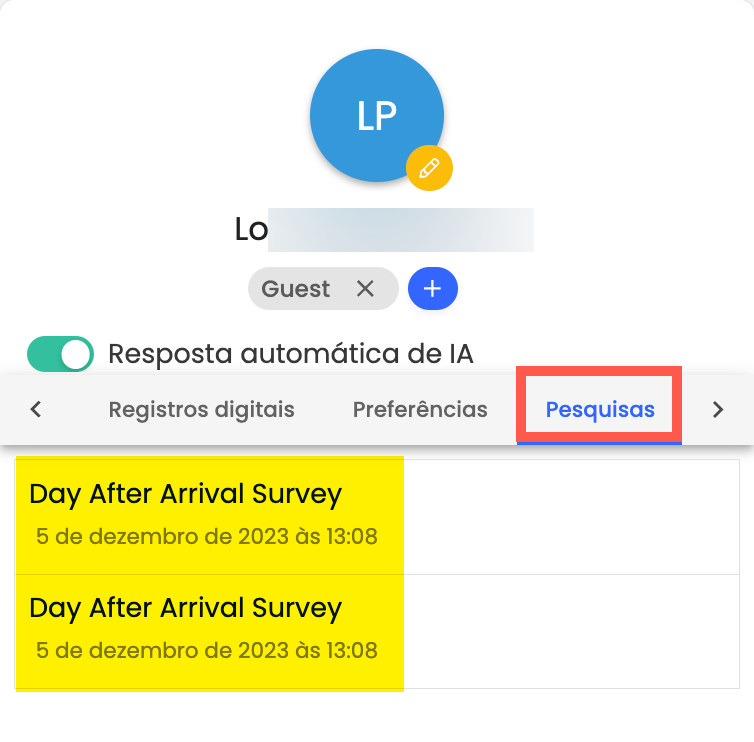 Você também pode visualizar o Histórico de Pesquisas de cada hóspede na página de Chat do Hóspede:
