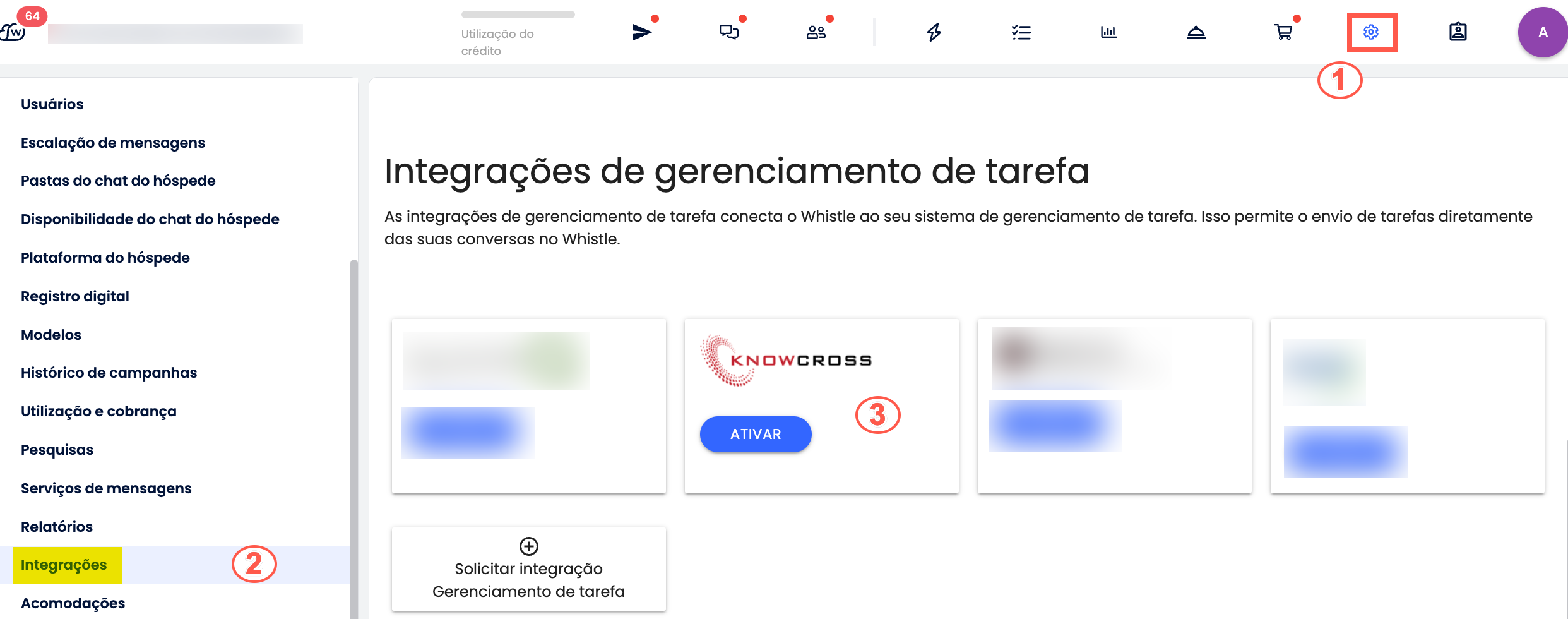 - Role a tela até Integrações de gestão de tarefas e ative o KnowCross.