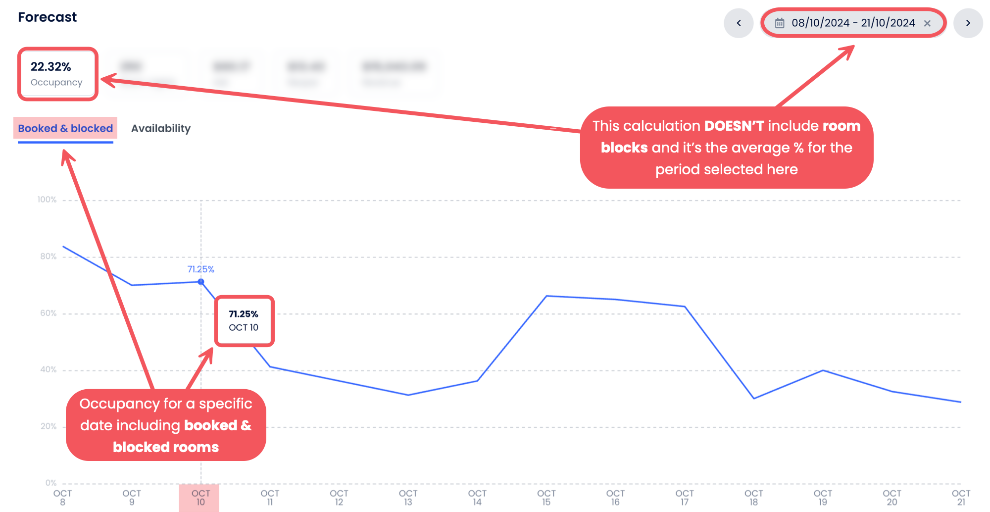 กล่าวอีกนัยหนึ่ง แม้แต่ห้องที่ถูกบล็อกหรือปิดให้บริการก็ยังถูกนับในจำนวนห้องพักทั้งหมดที่ใช้ในการคำนวณการเข้าพัก.