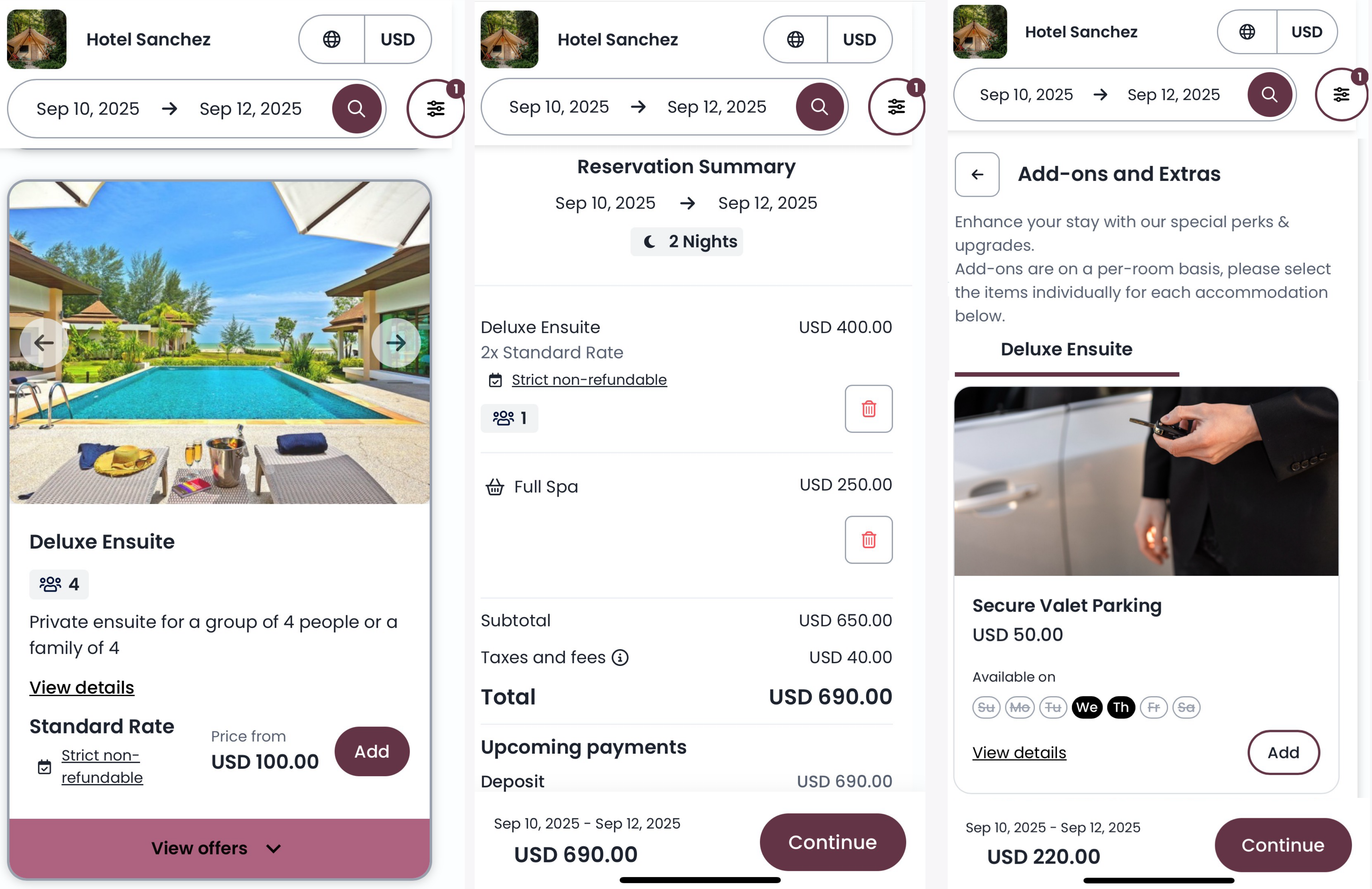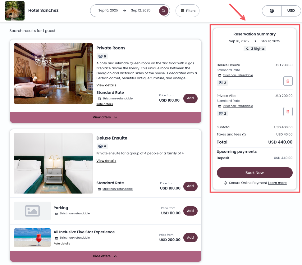 - สรุปแบบเรียลไทม์: การนับสดจะแสดงจำนวนผู้เข้าพักและห้องทั้งหมดก่อนที่จะเพิ่มลงในตะกร้า.