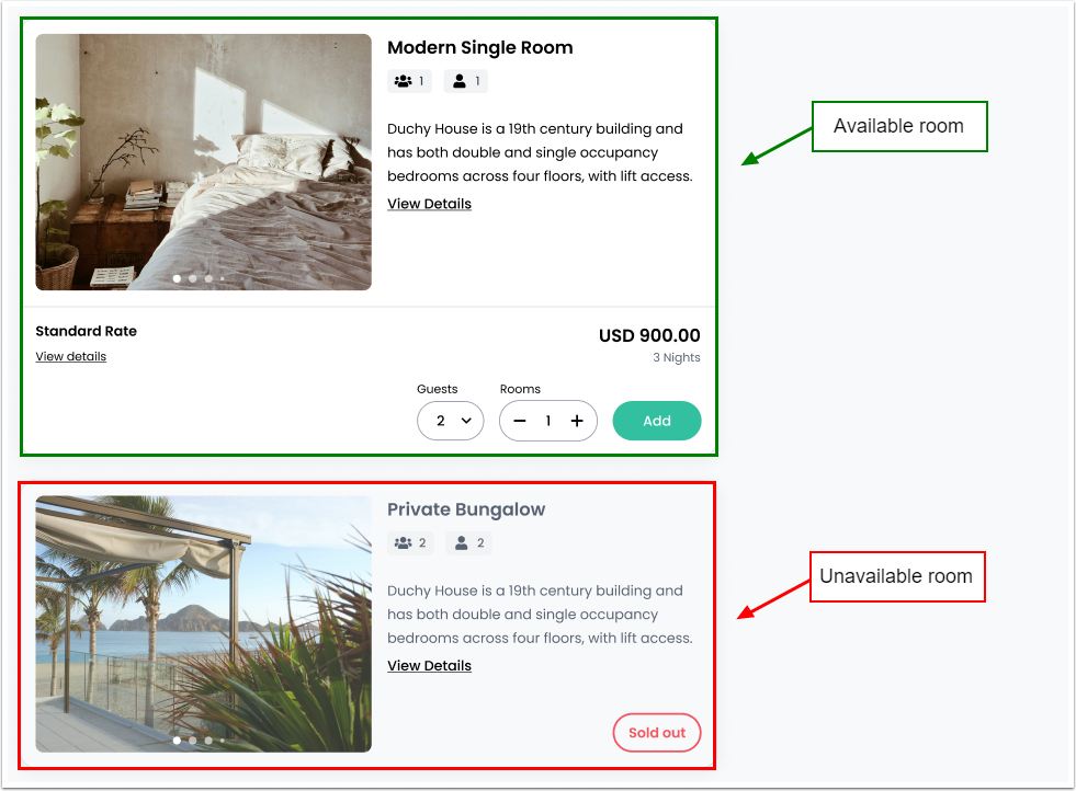 การแสดงรายการห้องพักที่ขายหมด แสดงห้องพักที่เป็นที่นิยมแม้ว่าจะถูกจองแล้ว เพื่อกระตุ้นให้แขกปรับวันเพื่อให้ได้ห้องพักนั้น. |