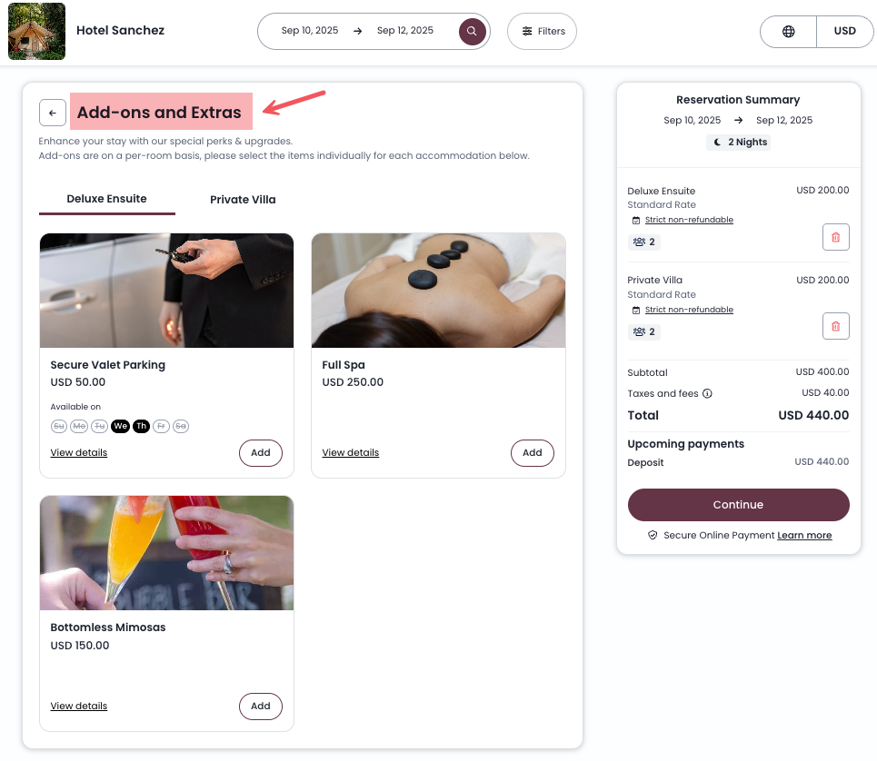 - การมองเห็นและการรับรู้ที่เพิ่มขึ้น: โดยการนำเสนอ บริการเสริม ก่อนขั้นตอนเช็กเอาต์ คุณมั่นใจได้ว่าลูกค้าจะทราบถึงผลิตภัณฑ์หรือบริการเพิ่มเติมที่พวกเขาสามารถซื้อร่วมกับการจองหลักของพวกเขา