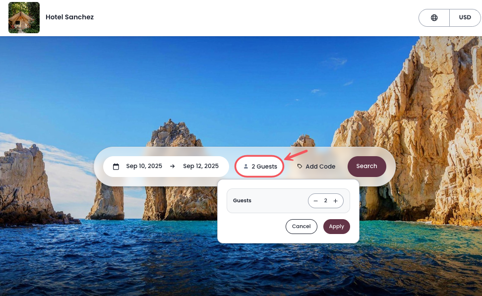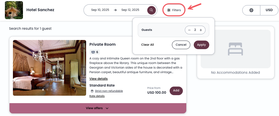 ขั้นตอนผู้เข้าพัก ใหม่ ทำให้การเลือกห้องและผู้เดินทางของผู้เข้าพักของคุณง่ายขึ้น แทนที่จะมีปุ่มหลายปุ่มสำหรับห้อง, ผู้ใหญ่, และเด็ก ตอนนี้ตัวเลือกทั้งหมดมีให้ในโมดูลเดียวที่เรียบง่าย: