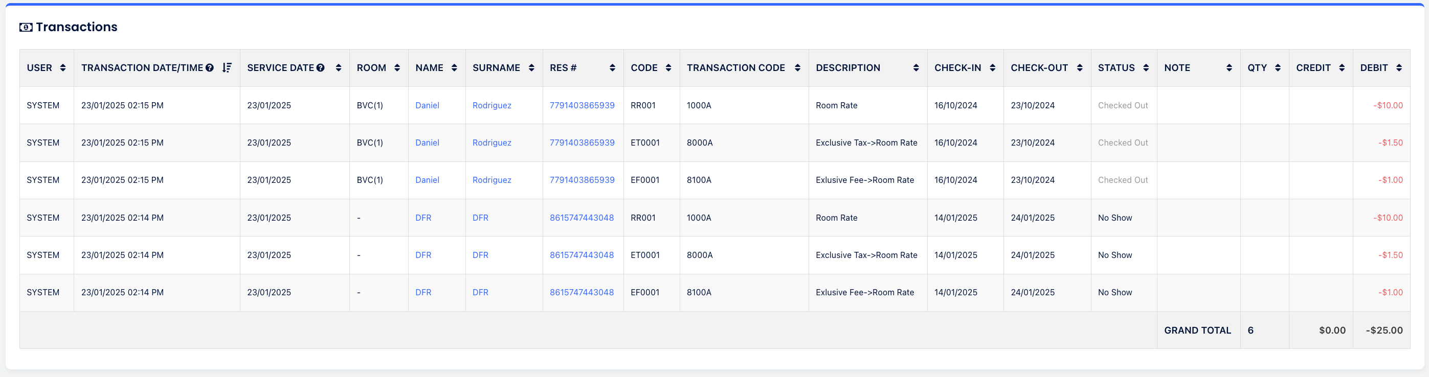 - Res #: คลิกที่หมายเลขการจองเพื่อเข้าสู่การจองของแขก