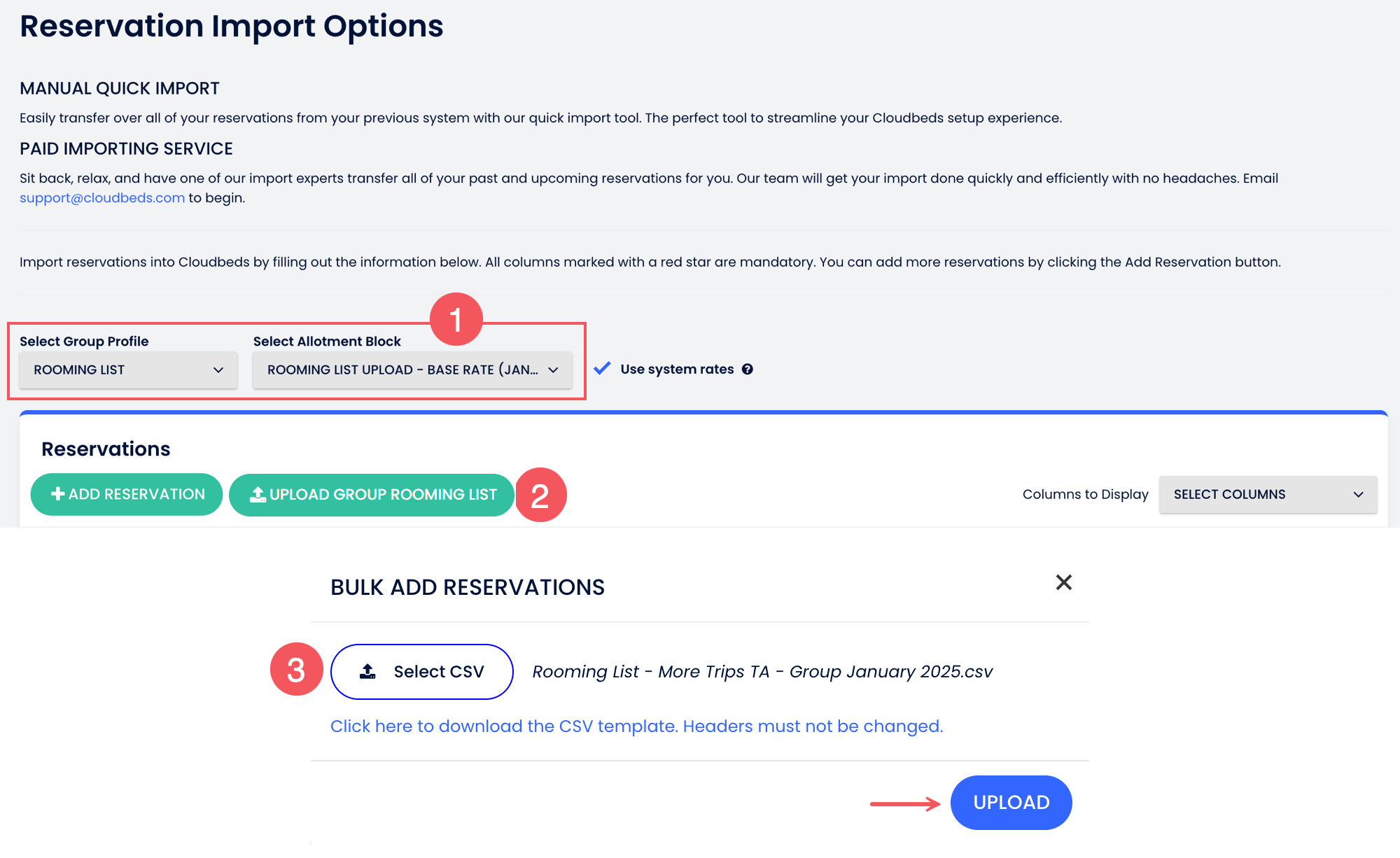 - หากคุณนำเข้าการจองไปยังโปรไฟล์กลุ่มและ ไม่ได้เลือก การจัดสรรห้องพัก แต่ทำเครื่องหมายที่ “ใช้อัตราระบบ”, ระบบจะใช้ อัตรามาตรฐาน.