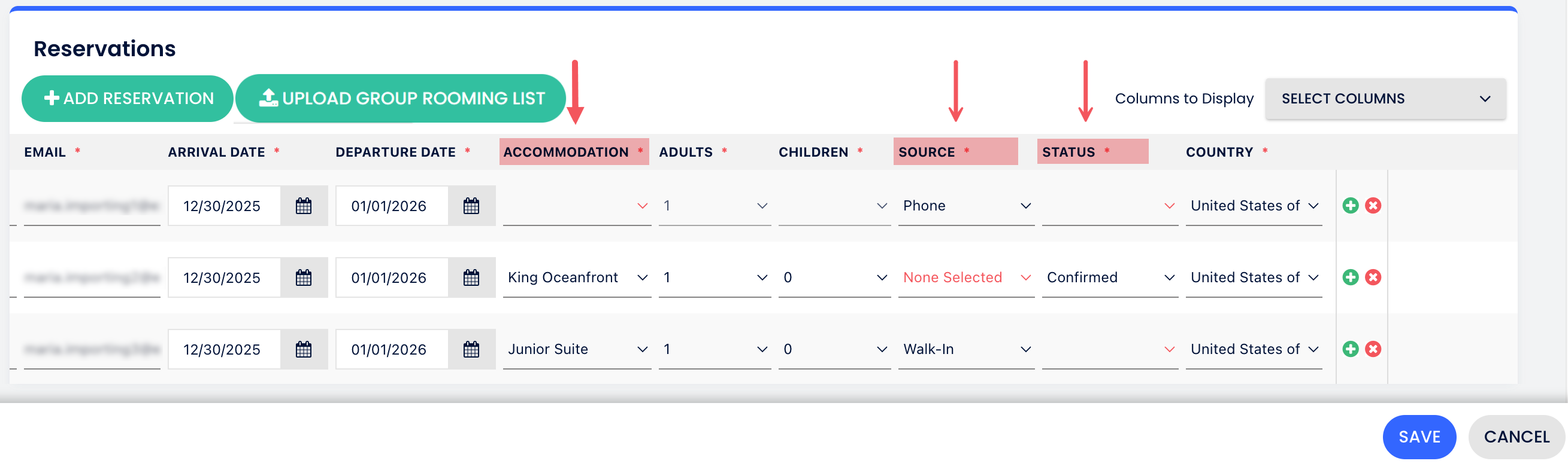 - เมื่อมี แหล่งที่มาจากบุคคลที่สาม (เช่น OTA) ถูกเลือกในคอลัมน์ แหล่งที่มา คอลัมน์ รหัสการจองจากแหล่งที่มา จะกลายเป็นช่องที่ต้องกรอก นี้จะทำให้ Channel Manager ของ Cloudbeds อัปเดตการจองอย่างถูกต้องเมื่อมีการเปลี่ยนแปลง/ยกเลิก หากคุณไม่ต้องการรหัสการจองจากแหล่งที่มาเพื่อรับการเปลี่ยนแปลงในอนาคตจากช่องทาง คุณสามารถพิมพ์ตัวเลขใดก็ได้