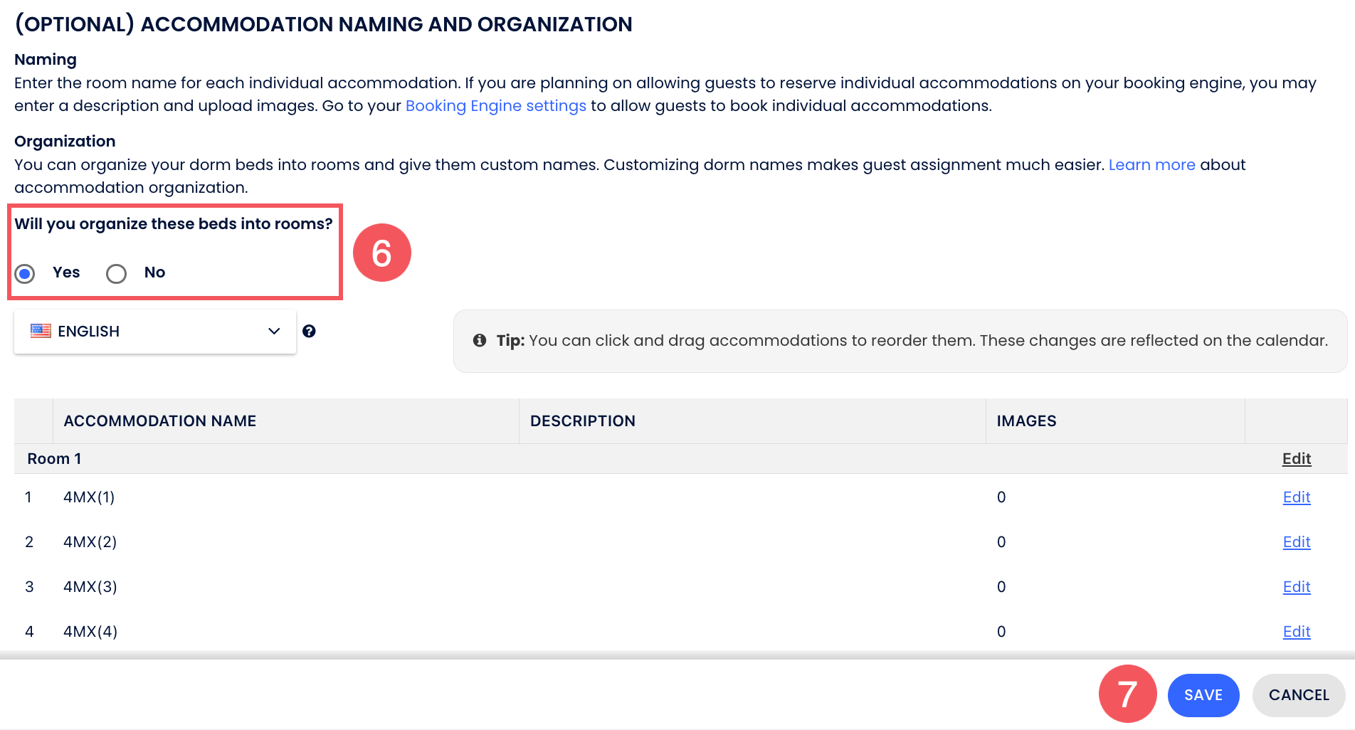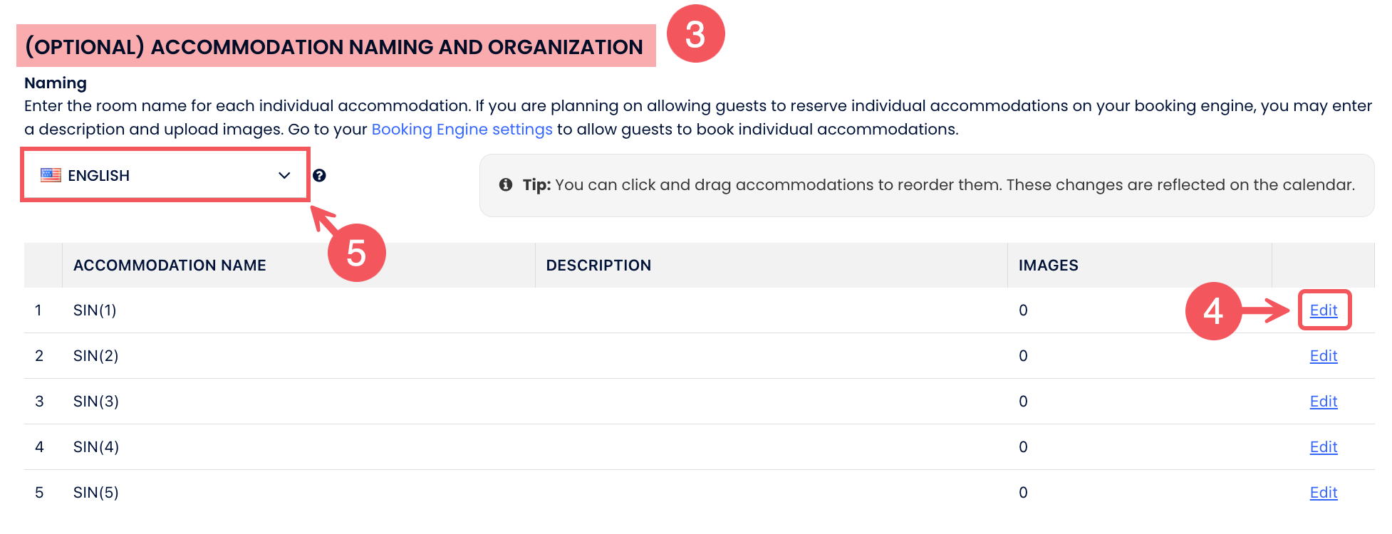 - คลิก แก้ไข เพื่อกรอกชื่อห้องสำหรับแต่ละที่พัก